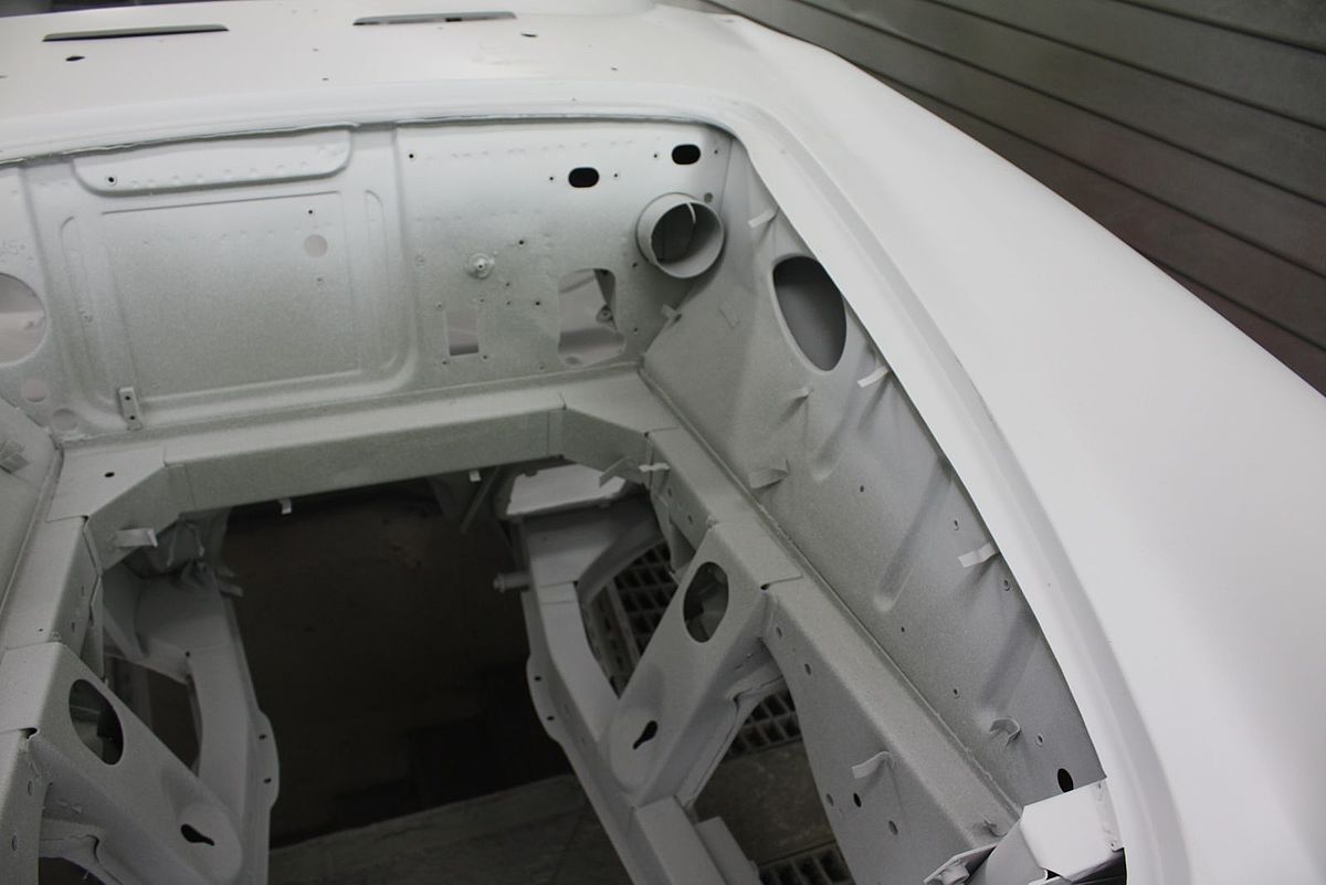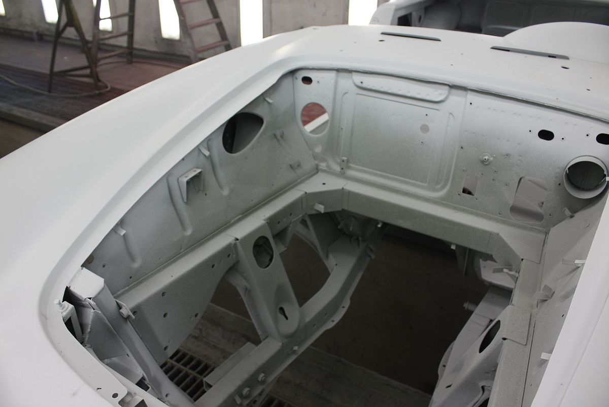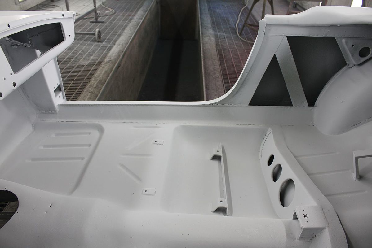 Als letztes wurde die Karosse feingestrahlt und mit Zinkromat grundiert. Ergebnis ist eine absolut saubere Grundlage für den Lackierer.