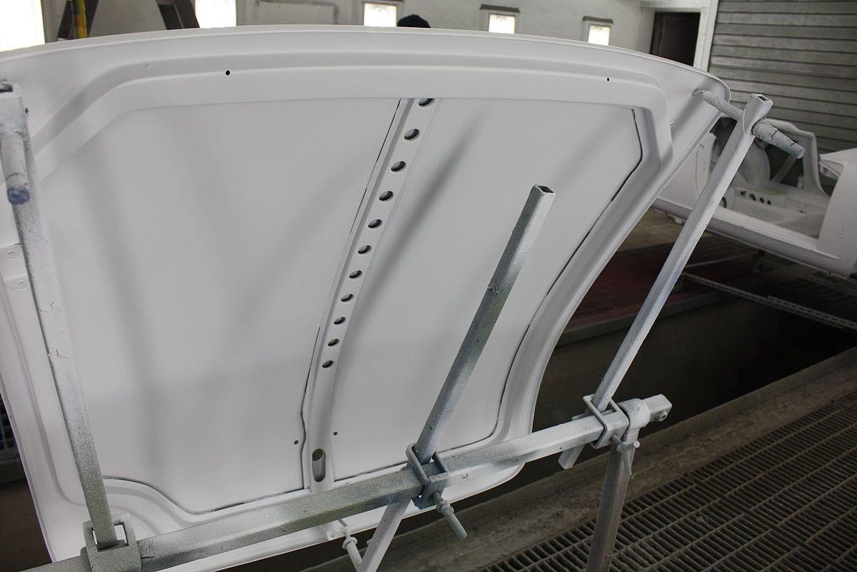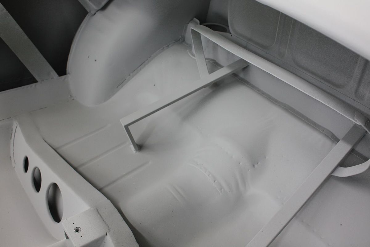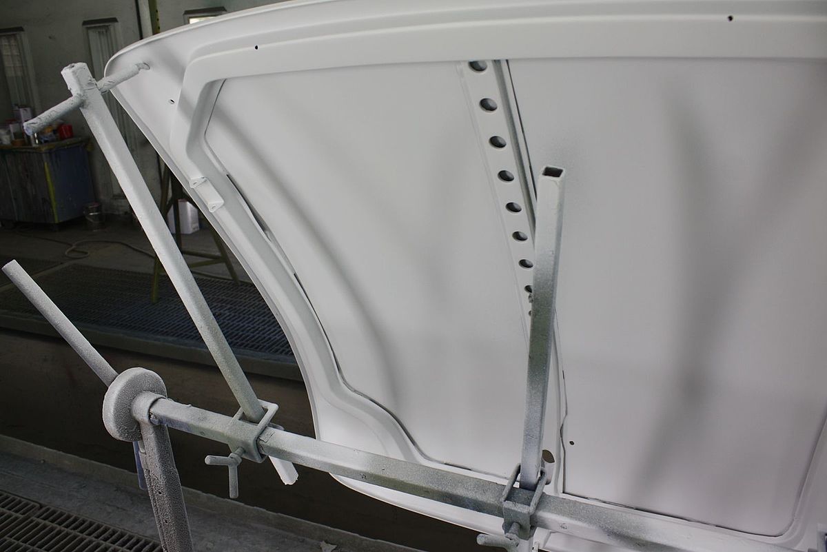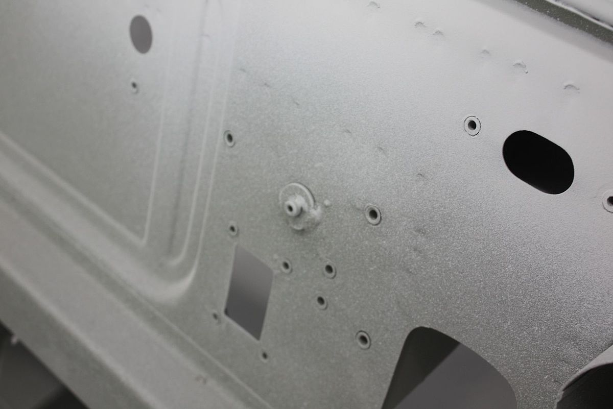 Als letztes wurde die Karosse feingestrahlt und mit Zinkromat grundiert. Ergebnis ist eine absolut saubere Grundlage für den Lackierer.