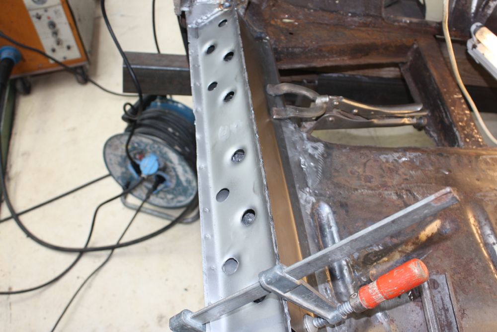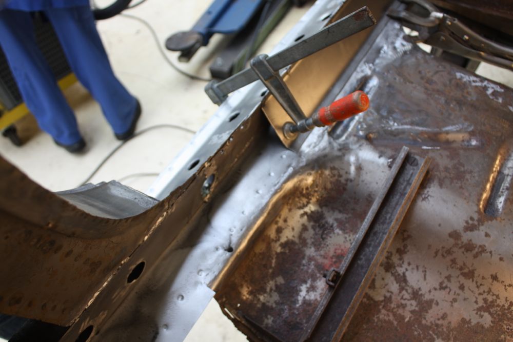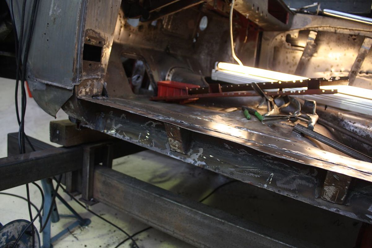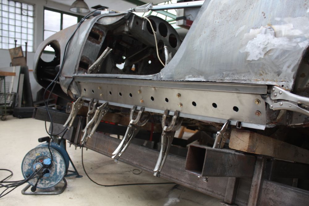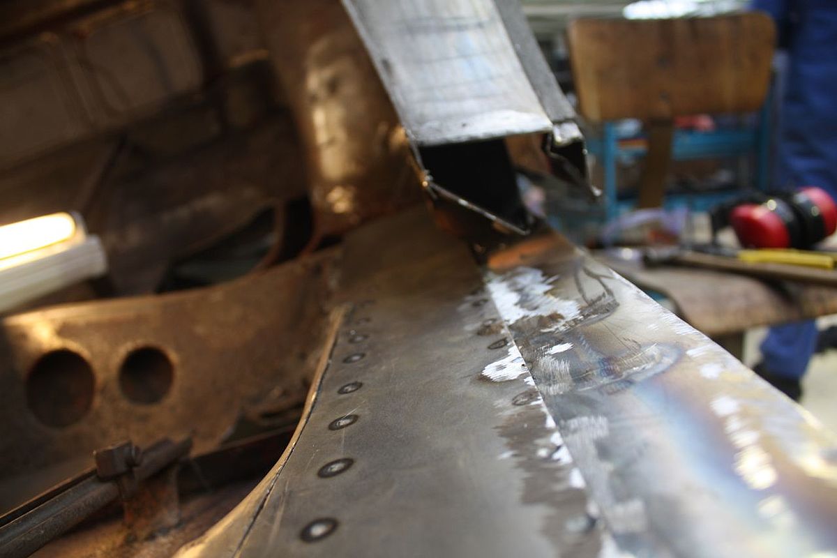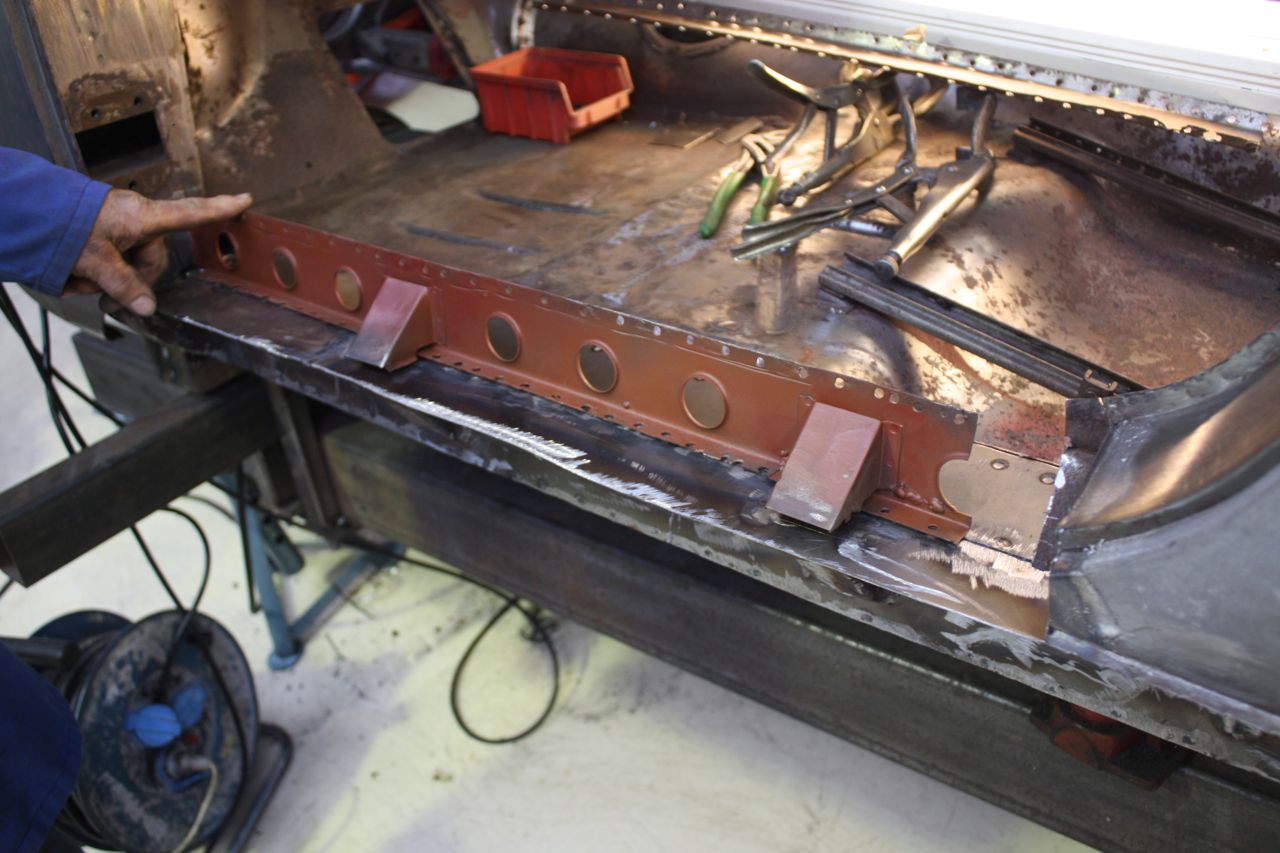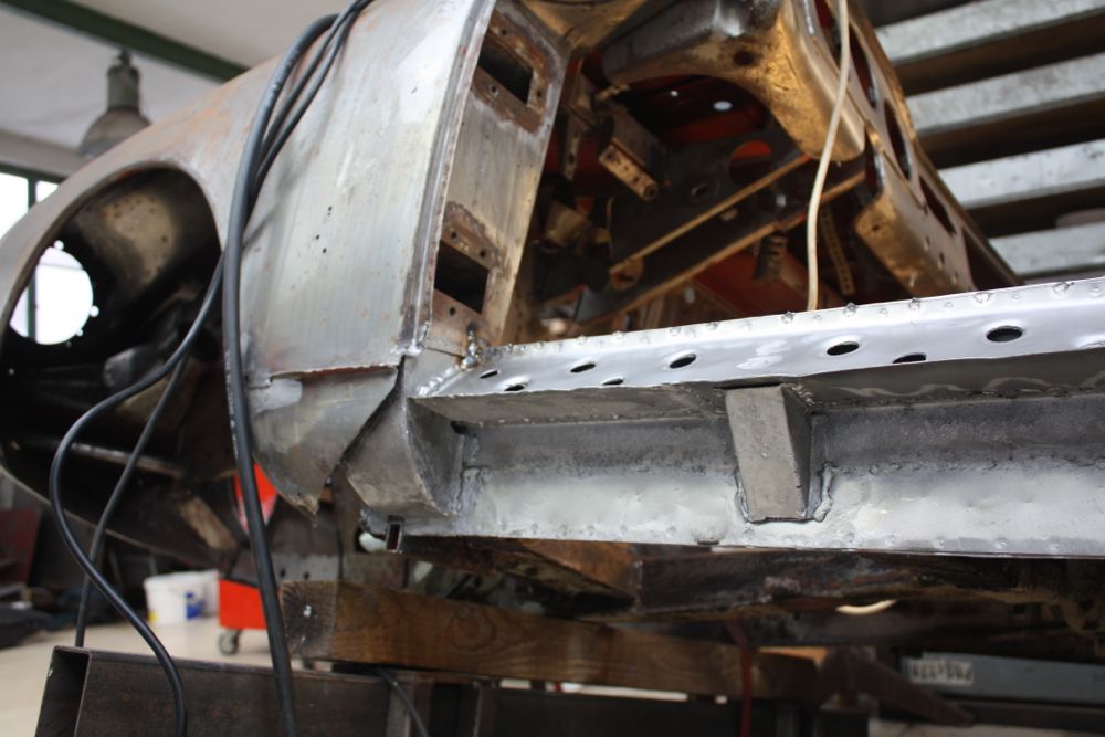 Der linke Schweller ist nun bis auf das äußere Blech wieder in seiner originalen Form und Bauweise wiederhergestellt - nun folgt die mittlere Quertraverse hinter den Sitzen. Leider war auch sie stark geschwächt und musste nachgebaut werden. Da sie aus zwei Einzelteilen besteht, haben wir zuerst den hinteren Abschluss des Bodens nachgeformt und verschweisst - nun folgt die ehemals gelochte 2. Hälfte der Traverse, welche dann im Verbund wieder die nötige Steifigkeit des Kastenprofils ergibt. Zur Sicherheit und Masshaltigkeit wurde eine provisorische Strebe aus Rechteckrohr angeheftet, welche dann nach dem verschweissen der zweiten Hälfte wieder rausgetrennt wird...
