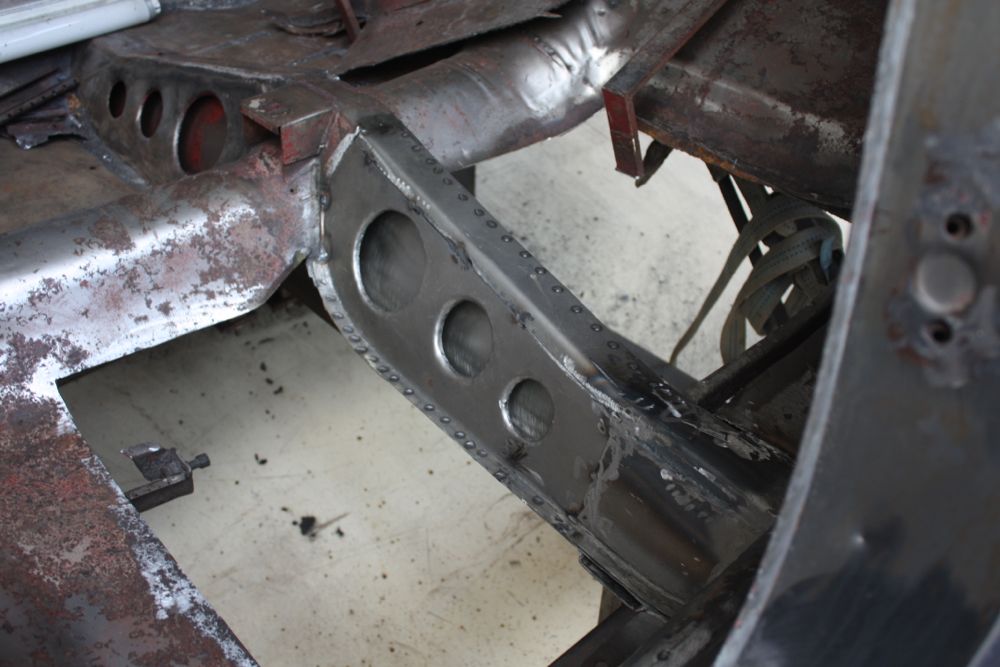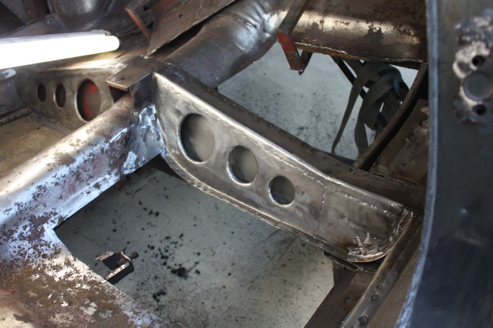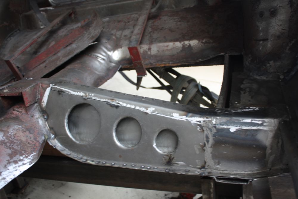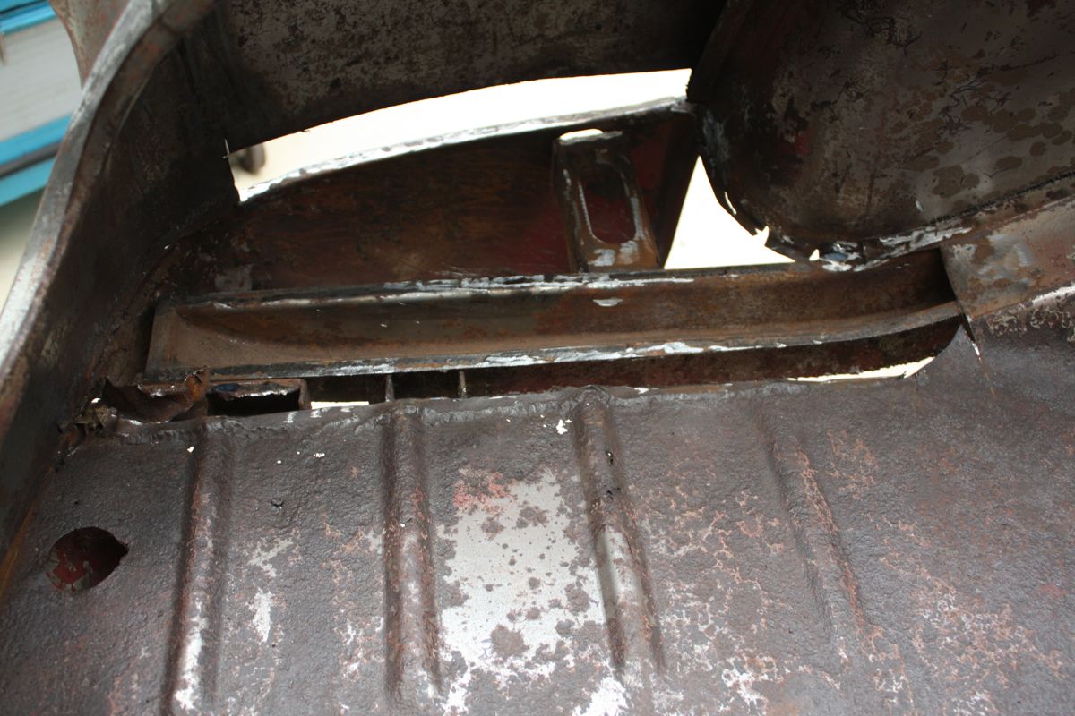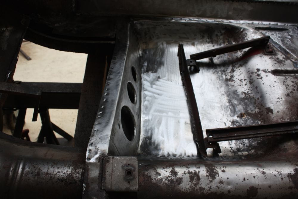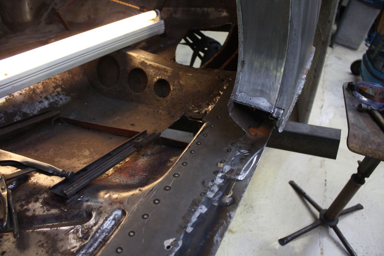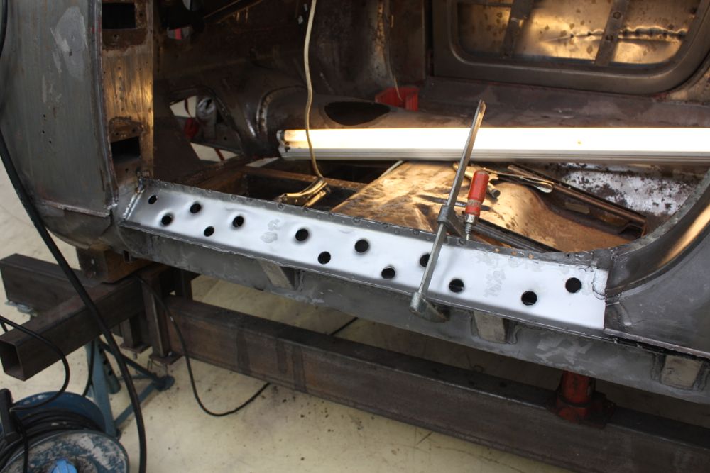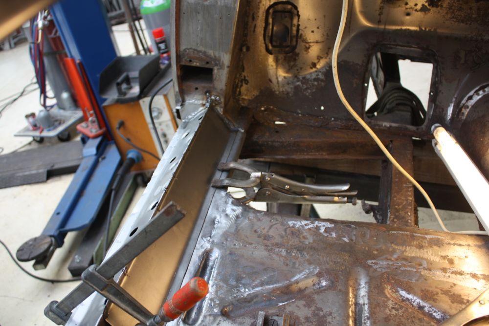 Der linke Schweller ist nun bis auf das äußere Blech wieder in seiner originalen Form und Bauweise wiederhergestellt - nun folgt die mittlere Quertraverse hinter den Sitzen. Leider war auch sie stark geschwächt und musste nachgebaut werden. Da sie aus zwei Einzelteilen besteht, haben wir zuerst den hinteren Abschluss des Bodens nachgeformt und verschweisst - nun folgt die ehemals gelochte 2. Hälfte der Traverse, welche dann im Verbund wieder die nötige Steifigkeit des Kastenprofils ergibt. Zur Sicherheit und Masshaltigkeit wurde eine provisorische Strebe aus Rechteckrohr angeheftet, welche dann nach dem verschweissen der zweiten Hälfte wieder rausgetrennt wird...