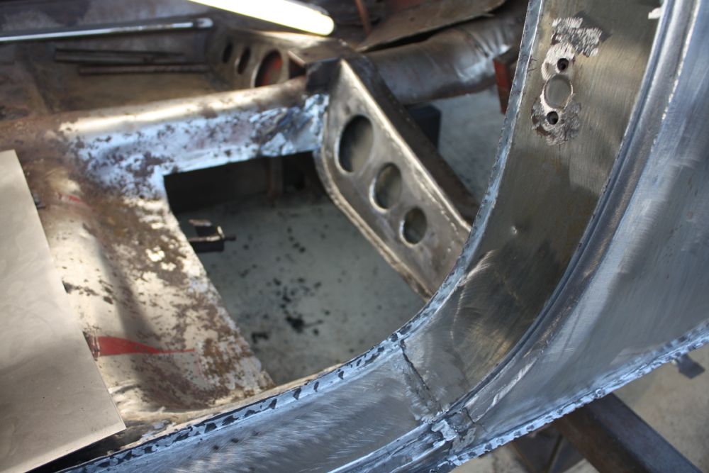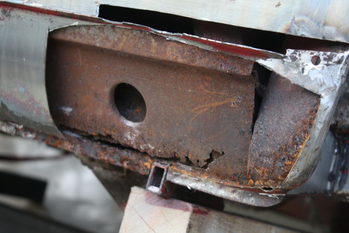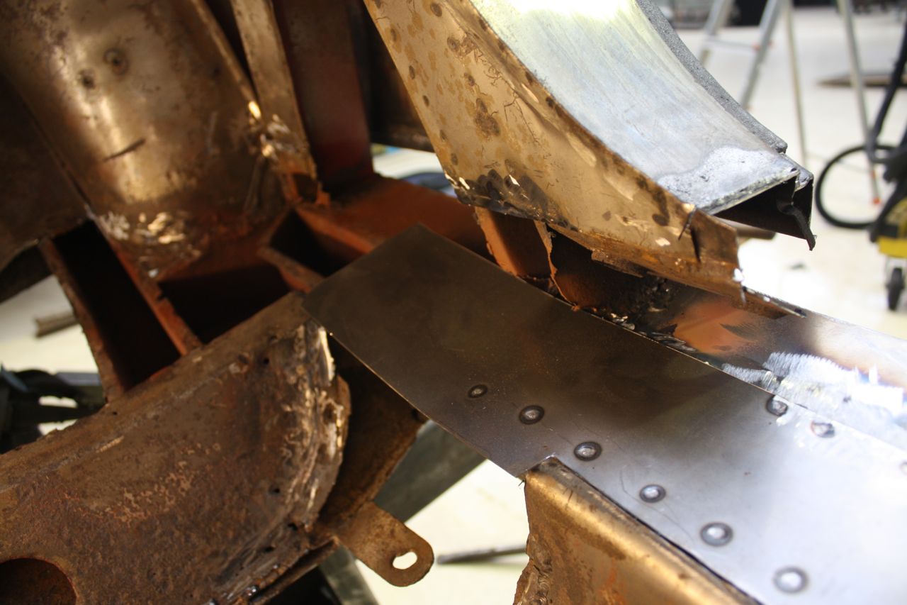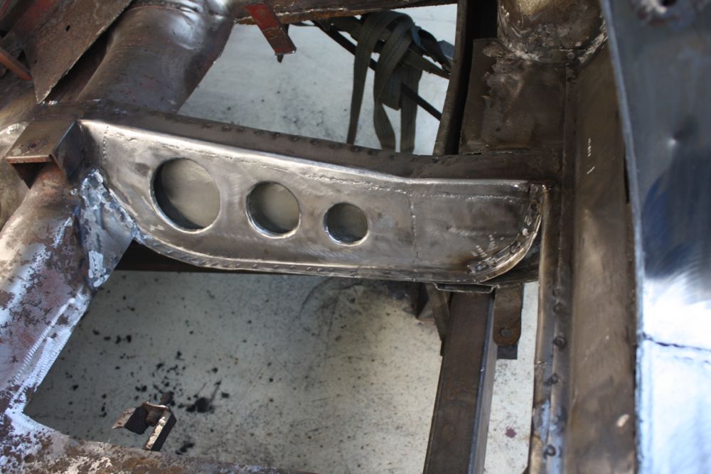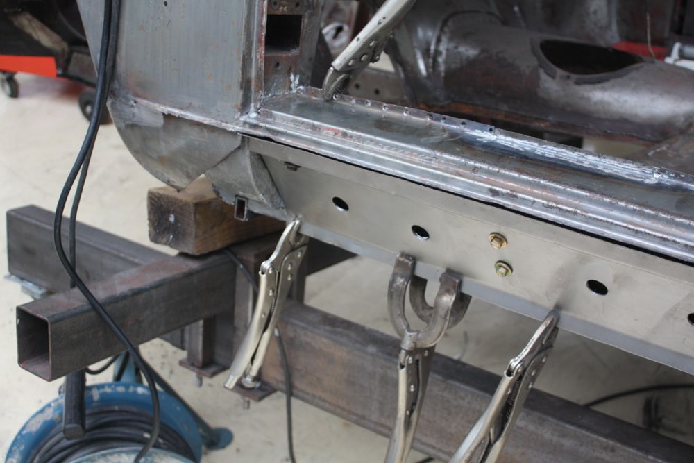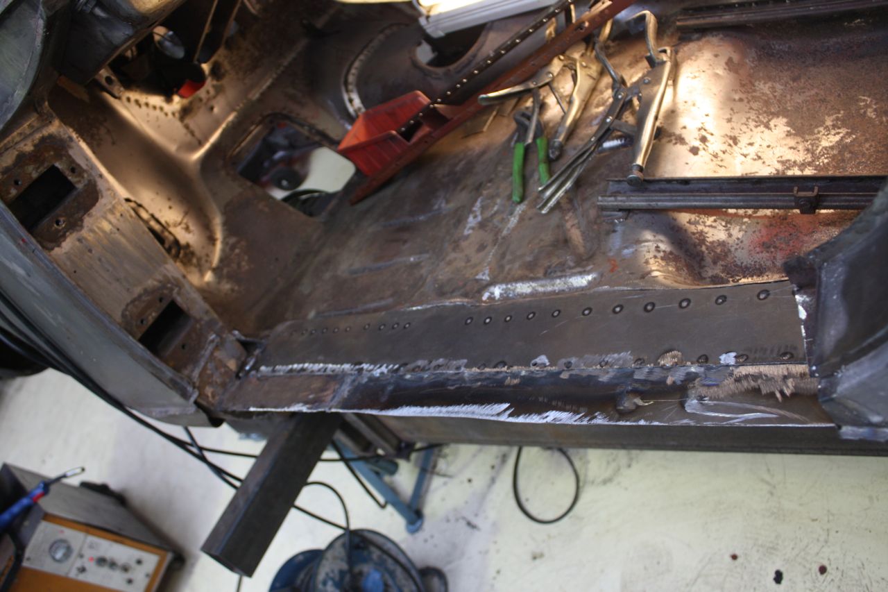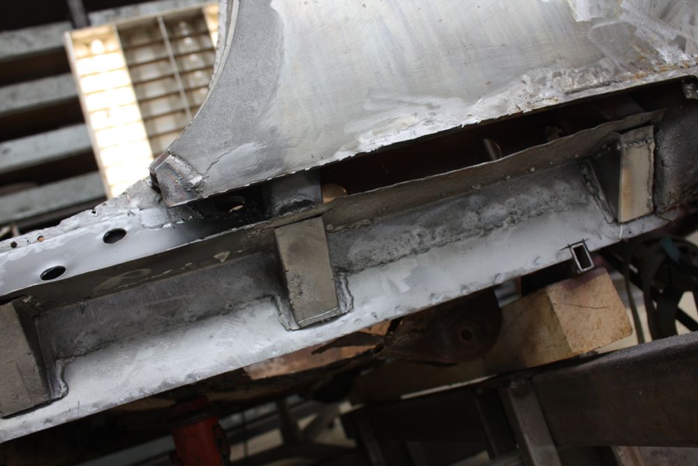 Der linke Schweller ist nun bis auf das äußere Blech wieder in seiner originalen Form und Bauweise wiederhergestellt - nun folgt die mittlere Quertraverse hinter den Sitzen. Leider war auch sie stark geschwächt und musste nachgebaut werden. Da sie aus zwei Einzelteilen besteht, haben wir zuerst den hinteren Abschluss des Bodens nachgeformt und verschweisst - nun folgt die ehemals gelochte 2. Hälfte der Traverse, welche dann im Verbund wieder die nötige Steifigkeit des Kastenprofils ergibt. Zur Sicherheit und Masshaltigkeit wurde eine provisorische Strebe aus Rechteckrohr angeheftet, welche dann nach dem verschweissen der zweiten Hälfte wieder rausgetrennt wird...