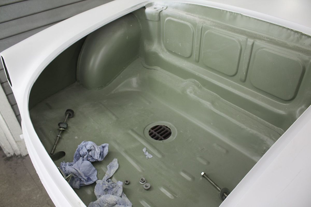 Der Kofferraumboden ist nun fertig. Unten zu sehen ist auch das untere Heckblech nach dem sandstrahlen, welches vor dem Verschweissen mit Epoxy-2K-Grundierung behandelt wurde. Nach dem anpunkten mit dem Punktschweisser ist das Heck in seinen Grundzügen bereit zum anpassen von Rückleuchten, Schloss und ähnlichem.