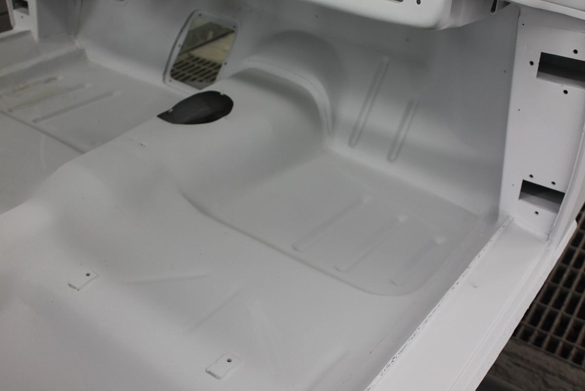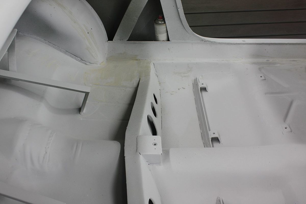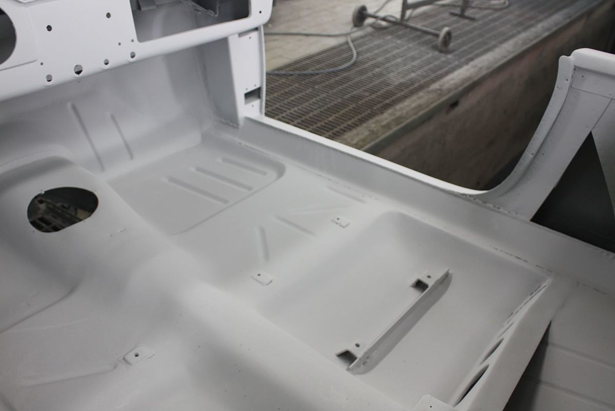 Das angekaufte Bodenblech der Firma OKP passt sehr gut. Die angrenzende Stehwand zum Motorraum links neben der Pdalerie war an der Unterkante natürlich auch fragmentiert und galt es auszutauschen. Nach diesem Schritt wurde der unter dem Boden verlaufende Querträger genau überprüft, entrostet und wieder in originalen Zustand versetzt - ebenso wie die Quertraverse in Bodenmitte, welche die vorderen Befestigungspunkte des Sitzes aufnimmt. Sie war erstaunlicherweise noch in sehr gutem und rostfreiem Zustand. Damit waren die Vorbereitungen zur Montage des vorderen Bodenblechs gegeben. Einzig der Übergang zur Pedalerie war etwas anzupassen. Nun wurde das Blech stumpf verschweisst und verpunktet. Das Ergebnis ist eine fast fertige, linke Bodengruppe, welche nun wieder die nötige Stabilität aufweist, um den nächsten Dekaden der stilechten Benutzung zu trotzen.
