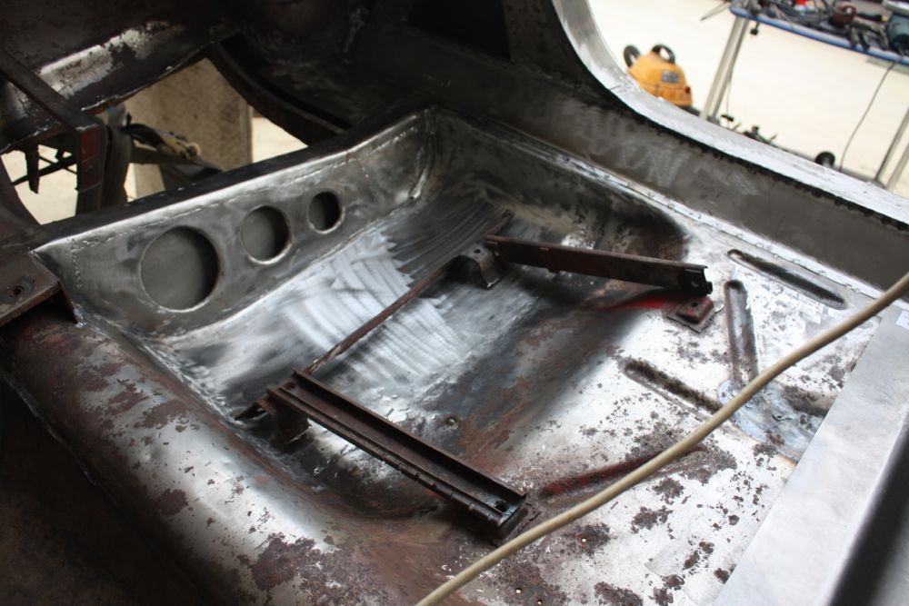 Nun haben wir das zweite Blech der Quertraverse hinter den Sitzen nachgefertigt und verschweisst - ebenso wurde nun der Boden unter dem linken Sitz angefertigt und eingesetzt. Als nächstes folgt nun der vordere Boden...