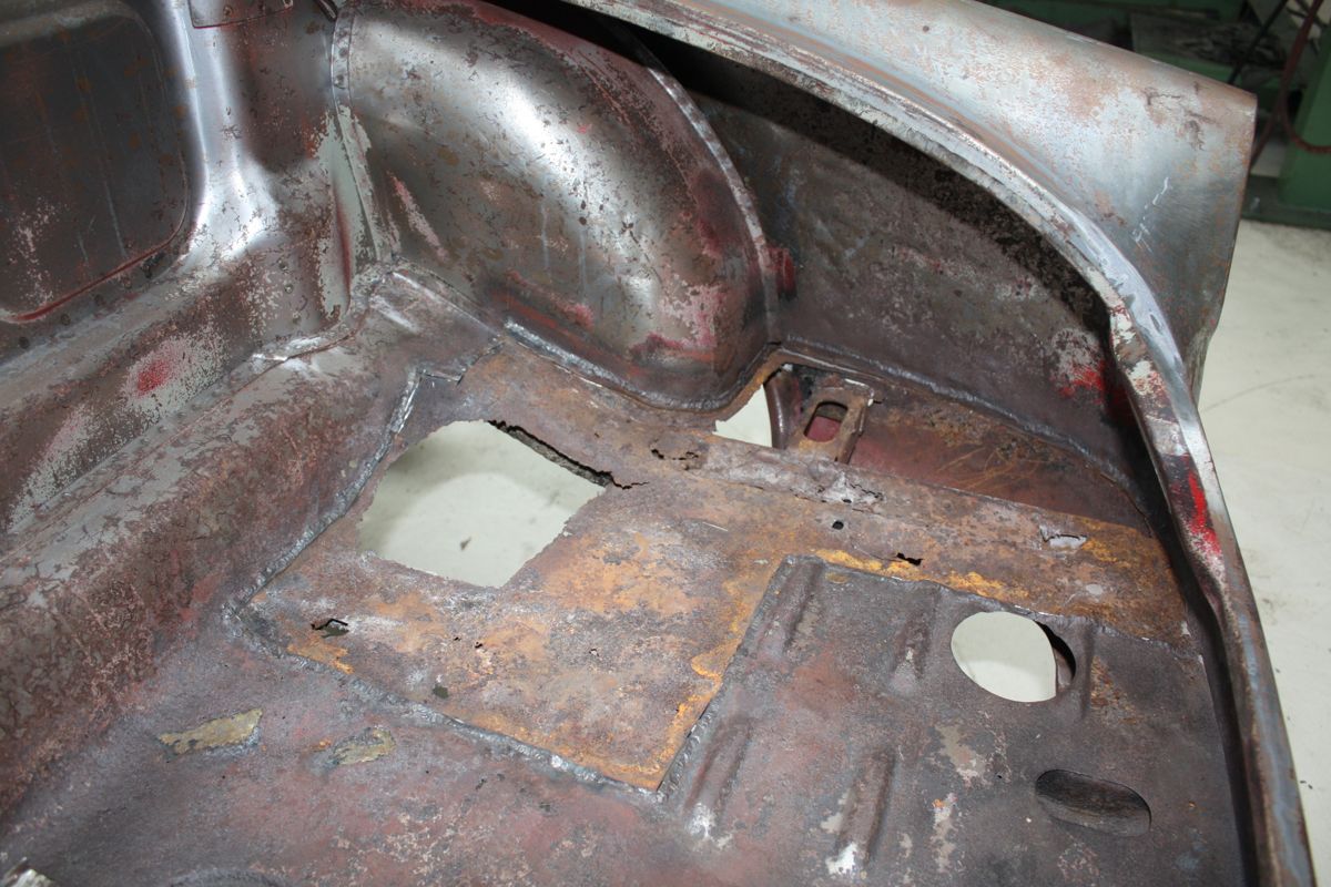 Gemeint ist der komplette Kofferraumboden. Vorbereitend haben wir das untere Heckblech in Gänze von den Seitenwänden und Heckblech oben getrennt, um den Boden nun von hinten bis an seine endgültige Position durchzuschieben. Danach wurde der vordere Trennschnitt des alten Blechs definiert und danach herausgetrennt. Als nächstes gilt es den jeweiligen Radlauf auf Backen hin zu überprüfen und diese ggf. mittels verstellbarer Stütze zwischen den beiden Radlaufendpunkten etwas zu glätten bzw. diese wieder in Form zu bringen. Bei dieser Aktion verändern sich die Kontaktpunkte des Hecks zum Kofferraumboden so weit, das man sie dann auch endgültig fluchtend zur gesamten Linie des Fahrzeugs fest verbindet.Auch ist die Gelegenheit günstig, das untere Heckblech feinstrahlen zu lassen - das Ergebnis wird dies rechtfertigen.