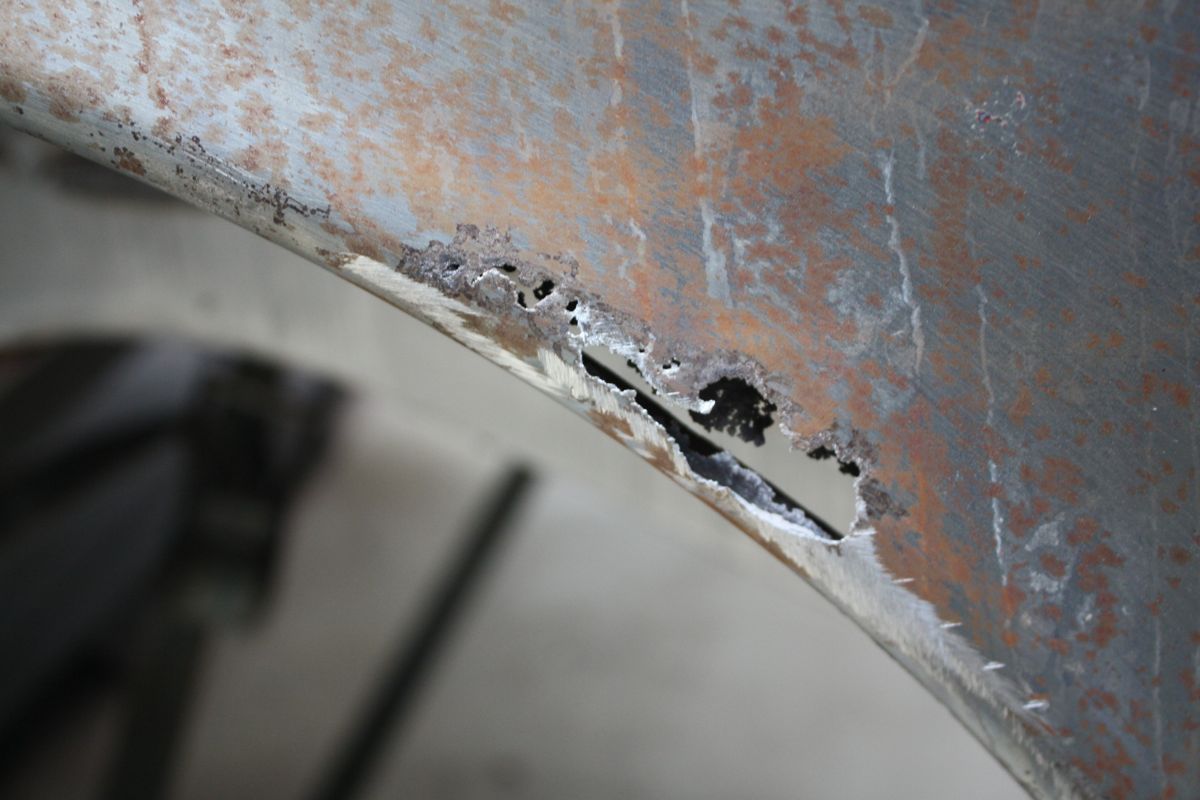 Darauf folgte der linke Schweller. Er ist zwar äußerlich noch in recht gutem Zustand gewesen, jedoch nach dem Öffnen präsentierte sich der Baujahr-übliche Rostfraß. Der Mittelschweller war an der Unterkante auf ganzer Länge fragmentiert. Ebenso der Innenschweller. Da aber der Bereich innerhalb der Tür noch in sehr gutem Zustand war, haben wir uns entschlossen den Innen-, sowie auch den Mittelschweller auf halber Höhe zu trennen und einen Teilersatz anzufertigen.