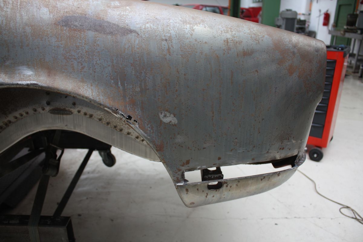 Der selbst angefertigte linke Aussenschweller hat nun die endgültige Form und wurde nun mittels Punktschweissmaschine wie original verschweisst. Als Abschluss ist der Verlauf der Kotflügelkanten noch anzugleichen, wobei das hintere Radhaus noch im unteren Bereich anzufertigen war. Die Passform steht dem Vorbild in nichts mehr nach und kann nun als fertig bezeichnet werden. Lediglich die Ausschnitte für die Halteklammern der Zierleiste sind noch festzulegen und zu erstellen - aber dank unserem Karosseriebauer Herrn Fichtel sind diese wohl morgen fertig und man kann die linke Seite des Fahrzeugs nun als lackierfertig bezeichnen. Im nächsten Schritt folgt nun der komplette Kofferraumboden, der noch als Gesamtes neben dem Fahrzeug auf seinen endgültigen Verbleib als tragendes Element des Fahrzeugs auf seine Verarbeitung wartet...